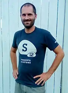 ![]() Justin Freeman, wearing a 12stone church youth ministry t-shirt | |