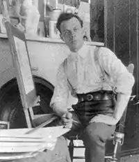 In New York, he spent two years (and a third year of night school) studying at the Art Students League. He came to know both American and European Impressionism, Post Impressionism, and Fauvism, modern approaches that helped shape his own style. A significant measure of this early success was his participation in two of North America’s most important exhibitions of art of the early 20th century: the famous Armory Show in 1913 (seen in New York, Boston, and Chicago) where he had five paintings exhibited and the Panama-Pacific International Exposition held in San Francisco in 1915.[5] He was represented by the N. E. Montross Gallery (the same gallery showed 'The Eight' or Ashcan School artists).[6] In 1912, he married Frances May (known as Patsy) and later they moved to Boston Corners, a small hamlet where Milne painted with oils and watercolours.[7] Milne left Boston Corners in 1917 for basic training in Toronto for World War I. He was stationed in Quebec and then quarantined in England for a month, during which time World War I ended. Because of his background as an artist, he was asked to complete paintings and drawings as a war artist. Milne produced artworks of battlefields in France and Belgium as well as of soldiers in Kinmel Park Camp in England.[8]