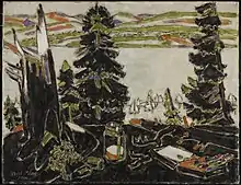 Between the years of 1919 and 1929, Milne lived in Boston Corners and the surrounding areas, focusing his artistic work on the landscape. He spent the winter of 1923–24 in Ottawa in hopes of finding government patronage and a position.[9] During his six months in the city, Milne produced several paintings and watercolours. Six of his works were purchased by the National Gallery of Canada. However, Milne was unable to secure a job in the federal government and returned to Upper New York State.[10] In 1929, Milne returned to Canada to paint in Temagami, Weston and Palgrave. He separated from his wife in 1933, moved to Port Severn, Ontario, and sold many of his paintings to prominent art patrons Vincent Massey and Alice Massey.[11] In the late 1930s, Milne settled down in Uxbridge, Ontario, with Kathleen Pavey, a nurse, and the two had a son (also David) in 1941. During the later years of his life, Milne worked again in watercolours, and changed his subject matter to more whimsical, fantasy and childlike inspirations. He continued to travel to Algonquin Park and Baptiste Lake to paint the Canadian landscape.[12]