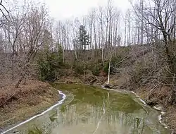 - 3.1 kilometres (1.9 mi) (or 1.6 kilometres (0.99 mi) in a direct line) winding up to the Sainte-Cardine stream (coming from the west);