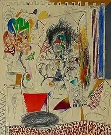 In the early 1970s, Sharpe began creating rhythmic, abstract works composed of repeated, brightly colored dots, dashes, squiggles and hatching, such as Untitled Landscape (1970), that critics described as pointillist or calligraphic "landscapes," and linked to Neo-Impressionism.[32][3][29][33] Less contained than his earlier works and lacking a single focal point, these still-complex compositions featured a patchwork of vignettes spread laterally across formats that were unified by color and rhythm.[32] Sharpe made extensive use of the white of the canvas and paper, heightening the impact of expressive marks made with a "controlled spontaneity" reminiscent of Kandinsky in their movement, lyricism, and vividness.[34][35][36][37]