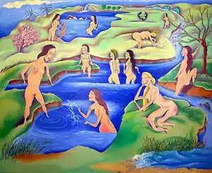 Sharpe somewhat controversially introduced figures (frequently based on his wife, Anne Abrons) into his work in the late 1970s, a development that critic William Zimmer, among others, called "an artistic gamble whose outcome is still in the balance."[33][38][7] Initially, he punctuated his dizzying compositions with small, often-hidden, Matisse-like nymphs.[1][7] However, by 1979, the figure emerged as his primary subject, with the patterned landscapes retreating to the background or to pictures hanging on interior walls.[3] These new works, such as The Bath (1981)[39] or the pastoral Bathers (1982), employed diverse art historical allusions: the interiors of Matisse; the distorted anatomies of Cubism and unschooled art; the odalisques of Ingres, Delacroix and Manet and monumental male bathers of Picasso; and the high-pitched color and extreme angularity of Imagism.[3][10][40]