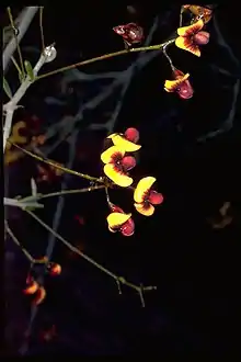 Daviesia bursarioides, commonly known as Three Springs daviesia,[2] is a species of flowering plant in the family Fabaceae and is endemic to a restricted part of the south-west of Western Australia. It is a straggling shrub with widely-spreading, spiny branches, scattered, flattened phyllodes, and yellow, deep pink and maroon flowers.