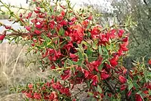 Daviesia cunderdin, commonly known as Cunderdin daviesia,[2] is a species of flowering plant in the family Fabaceae and is endemic to a restricted area in the south-west of Western Australia. It is a compact, densely-branched shrub with scattered, elliptic to egg-shaped phyllodes, and uniformly red flowers.