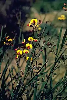 Daviesia longifolia is a species of flowering plant in the family Fabaceae and is endemic to the south-west of Western Australia. It is an erect, many-stemmed shrub with scattered, erect, cylindrical phyllodes and yellow and red flowers.