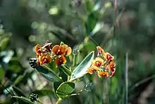 Daviesia ovata, commonly known as broad-leaf daviesia,[2] is a species of flowering plant in the family Fabaceae and is endemic to a restricted part of the south-west of Western Australia. It is a dense, bushy, glabrous shrub with egg-shaped to elliptic phyllodes and orange and maroon flowers.