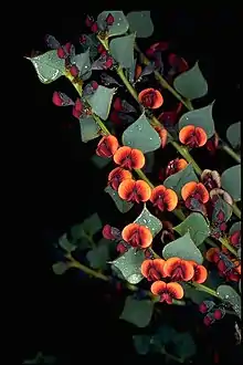 Daviesia rhombifolia is a bushy, spreading shrub that typically grows to a height of 30–80 cm (12–31 in) and has many stems. Its phyllodes are scattered, rhombus-shaped, 8–30 mm (0.31–1.18 in) long, 5–25 mm (0.20–0.98 in) wide and sharply pointed. The flowers are arranged in one or two groups of three flowers in leaf axils on a peduncle up to 0.5 mm (0.020 in) long, each flower on a pedicel 3–6 mm (0.12–0.24 in) long. The sepals are 3.0–4.5 mm (0.12–0.18 in) long and joined at the base, the upper two joined for most of their length, the lower three with lobes about 0.5 mm (0.020 in) long. The standard petal is broadly elliptic with a notched tip, 5–6 mm (0.20–0.24 in) long, 5.5–6.5 mm (0.22–0.26 in) wide, and orange with a red base. The wings are 4.0–5.5 mm (0.16–0.22 in) long and orange-red, the keel 4.0–5.5 mm (0.16–0.22 in) long and red. Flowering occurs from July to September and the fruit is a triangular pod 12–15 mm (0.47–0.59 in) long.[2][3]