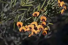Daviesia teretifolia is a spreading, glabrous, glaucous shrub that typically grows to a height of up to 1.2 m (3 ft 11 in). Its phyllodes are tapering cylindrical, upwards-pointing, 17–47 mm (0.67–1.85 in) long, 1.5–2 mm (0.059–0.079 in) wide and sharply pointed. The flowers are arranged in a group of three or four in leaf axils on a peduncle 2–7.5 mm (0.079–0.295 in) long, the rachis 2–7 mm (0.079–0.276 in) long, each flower on a pedicel 8–15 mm (0.31–0.59 in) long. The sepals are 4.5–5.5 mm (0.18–0.22 in) long and joined at the base, the two upper lobes joined for most of their length and the lower three lobes triangular. The standard petal is elliptic with a notched centre, 7.5–8.5 mm (0.30–0.33 in) long, 7.0–9.5 mm (0.28–0.37 in) wide and yellow to orange with a dark red to black centre. The wings are 7–8 mm (0.28–0.31 in) long and maroon, the keel 7.5–8 mm (0.30–0.31 in) long and maroon. Flowering occurs from May to October and the fruit is an inflated, triangular pod 13–16 mm (0.51–0.63 in) long.[2][3]