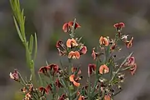 - Daviesia ulicifolia subsp. incarnata G.Chandler & Crisp[14] has narrow elliptic, or narrow egg-shaped to linear phyllodes 9.5–22 mm (0.37–0.87 in) long and 1–3 mm (0.039–0.118 in) wide with one to seven flowers in leaf axils, the standard petal 7–8 mm (0.28–0.31 in) wide and reddish-orange with a dark red base and a yellow centre;[3][12]