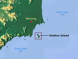 Dazhou Island (commonly known as Grand Island or Tinhosa Island) is a state-level nature reserve located about 5 km off the coast of Wanning, Hainan, China. This protected area covers 4.36 square kilometres, and comprises three mountains spanning two islands. These mountains, the tallest of which is 289 metres above sea level, have been used as navigational markers by mariners since the Tang Dynasty.[1]