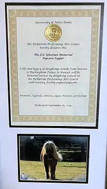 Adjacent to the Michael Browning Family Cinema, visitors will find a plaque dedicating the popcorn popper within the building's concession stand to Pawnee Indiana's famous miniature horse Li'l Sebastian, who earned an honorary degree from Notre Dame. The plaque features a photo of Li'l Sebastian and the University of Notre Dame seal, and it reads: "The DeBartolo Performing Arts Center hereby declares this The Li'l Sebastian Memorial Popcorn Popper. A life and legacy of delighting crowds from Pawnee to Buckingham Palace to Kuwait will be honored forever by delighting crowds at the DeBartolo Performing Arts Center with buttery, freshly popped popcorn. Animalus, legenda, amicus, equus Pawnee, perfectum."[10]