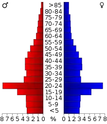 Of the 38,484 households, 31.9% had children under the age of 18 living with them, 47.2% were married couples living together, 10.2% had a female householder with no husband present, 38.2% were non-families, and 25.8% of all households were made up of individuals. The average household size was 2.56 and the average family size was 3.11. The median age was 29.3 years.[11]
