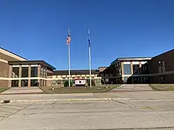 Until 1870, schooling for all grades in De Pere, Wisconsin was held in one building; starting in 1870, a high school was located in a stone building on the corner of James Street and Wisconsin Street.[2] During the back half of the 1890s, plans were made for a new high school at the corner of Chicago Street and Broadway. A fire ravaged the stone school on February 20, 1900; it was demolished in 1906 after sitting dormant.[2] After spending the rest of the term at the local German Benevolent Society Hall, the school located at Chicago and Broadway opened in fall 1900. It was quickly nicknamed the "Castle School" or "Castle on the Hill" due to its architecture and topographic situation.[3] In 1978, the current high school was built at 1700 Chicago Street. It underwent major expansion in 2001, with the addition of a gymnasium and several classrooms. In January 2007, more classrooms were added. In 2017, De Pere High School underwent another small expansion. De Pere High School's mascot is the Redbird.