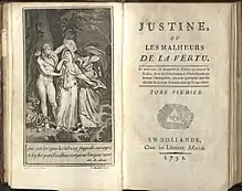 On Sade's release, his wife sought a legal separation and the marriage was dissolved in September 1790.[74] In August, he met Marie-Constance Quesnet, a 33-year-old actress, and they began a relationship which was to last until his death.[75] Sade now called himself "Louis Sade, man of letters" and tried to launch a career as a writer. His novel Justine, or the Misfortunes of Virtue was published anonymously in June 1791.[76] In October, his play, Oxtiern, opened at the Théâtre Molière in Paris, but closed after only two performances following audience uproar.[77]