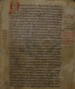 Later manuscripts do, however, use the term c(h)ronicon and its variant, c(h)ronica.[3] The earliest is manuscript P, which contains the title De captione Jerusalem (On the capture of Jerusalem) added to the margin by a late medieval hand. The same manuscript also contains the more conventional title Cronica de terra sancta added by a modern hand.[4] In the 16th or 17th century, somebody added the title Chronicon terrae sanctae expugnatae a Saladino (Chronicle of the Holy Land captured by Saladin) to manuscript V, which was copied also in V2.[5][6] V3, on the other hand, entitles it Chronica de Captione Jerusalem a Sarracenis (Chronicle of the capture of Jerusalem by the Saracens).[7] In the 17th or 18th century, the title Cronicon terrę sanctę was added to manuscript A, probably by Bishop Thomas Tanner.[8]