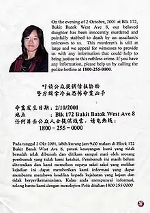 - ↑ "Murder victim's family puts up posters". The Straits Times. 7 October 2001.