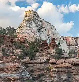 Deertrap Mountain is composed of white Navajo Sandstone and set on the east rim of Zion Canyon. It is situated one mile southeast of Zion Lodge, and three miles northeast of park headquarters. The nearest neighbor is Mountain of the Sun, one-half mile to the west, and the nearest higher peak is Twin Brothers, 0.68 miles (1.09 km) to the southwest.[3] The East Temple is situated 1.1 mile to the south-southwest, and Ant Hill is set 1.4 miles (2.3 km) to the southeast. Pine Creek originates at Deertrap, and the North Fork of the Virgin River drains precipitation runoff from this mountain. This feature's name was officially adopted April 4, 1934, by the U.S. Board on Geographic Names.[1] It is believed that the Paiute drove mule deer onto the mesa here, trapping them for food.[4]