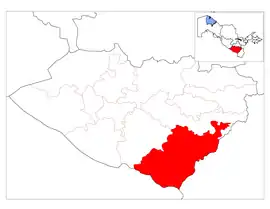 Dehqonobod District (Uzbek: Dehqonobod tumani / Деҳқонобод тумани, Russian: Дехканабадский район, romanized: Dekhkanabadsky rayon) is a district of Qashqadaryo Region in Uzbekistan. The capital lies at Karashina.[1] It has an area of 2,660 km2 (1,030 sq mi)[2] and its population is 149,800 (2021 est.).[3] The district consists of 3 urban-type settlements (Karashina, Dehqonobod, Beshbuloq) and 14 rural communities.[1]
