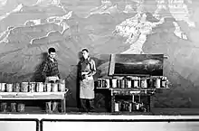 Del Yoakum (left) working with another artist to paint the dioramic Grand Canyon scene at Disneyland
