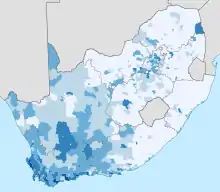In the general elections of 2019, the DA's national support declined for the first time in its history.[24] The party retained control of the Western Cape but with a reduced majority and failed to win Gauteng once again.[25][26] The conservative Freedom Front Plus made significant gains on the DA in the Afrikaner community.[27] Since the election, the FF Plus has continued to make inroads in former DA strongholds.[28][29]