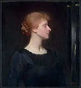 By 1887 Bunker completed his Portrait of Anne Page, a painting requiring much labor, but one of his most poignant works.[4] In its restrained use of color, delicate modeling of form, and aesthetic elegance it is reminiscent of the works of Thayer and James McNeill Whistler. There soon followed the Boston commissions, portraits mostly of male sitters—still somber in tone, they are painted in a more confident manner, suggesting the influence of Sargent (Portrait of George Augustus Gardner, 1888, Museum of Fine Arts, Boston).