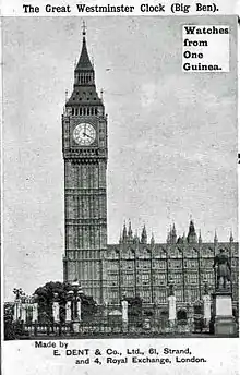 Dent was a London manufacturer of luxury clocks and watches, founded by Edward John Dent. Dent began making watches in 1814, although the Dent triangular trade mark was not registered until 1876. A notable success for the company was winning the contract to make the clock for the new palace of Westminster, which became known as Big Ben.