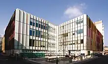 In 1954, Hans Krebs was appointed the Whitley Chair of Biochemistry, and his appointment brought greater prominence to the department. He brought with him the Medical Research Council unit established to conduct research on cell metabolism.[6] In 1955, a second professorship in the department, the Iveagh Chair of Microbiology, was established with funding from Guinness and the sub-department of Microbiology created, with Donald Woods its first holder.[7] The eight-storey Hans Krebs Building was constructed in 1964 with funds from the Rockefeller Foundation. Krebs was succeeded by Rodney Porter in 1967. Genetics was brought into the Biochemistry Department when Walter Bodmer was appointed the first Professor of Genetics in 1970.[8] The Laboratory of Molecular Biophysics, first established in the Zoology Department with support from Krebs and also linked to the Physical Chemistry Laboratory of the Chemistry Department, became part of the Biochemistry Department. It moved into the Rex Richards building built in 1984, with David Phillips the Professor in Molecular Biophysics.[2] The Oxford Glycobiology Institute, headed by Raymond Dwek and housed in the Rodney Porter Building, opened in 1991.[9]