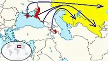 The deportation of the Soviet Greeks (Greek: Εκτοπισμός Ελλήνων της Σοβιετικής Ένωσης, Russian: депортация греков в СССР) was a series of forced transfers of Greeks of the Soviet Union that was ordered by Soviet leader Joseph Stalin and carried out by the NKVD and the MVD in 1942, 1944 and 1949. It affected mostly Pontic Greeks along the Black Sea coast, most notably from Krasnodar Krai from where they were deported in all three deportations, resulting in ethnic cleansing of this area. The deported Soviet and foreign Greeks residing along the coast of Crimea and the Caucasus were resettled in cattle trains to the modern Kazakhstan and Uzbekistan, while their property, which was left behind, was confiscated. After de-Stalinization in the 1950s, some Greeks returned to their original homes, but most chose to emigrate to Greece, marking the end of the centuries long Greek community along the Black Sea coast. It is estimated that around 70,000 to 80,000 Greeks were uprooted in these three waves of deportations.[nb 1] At least 15,000 Greeks had died by the end of the deportations.[6] Some scholars characterize the deportation as a genocide against Greeks.[7][8]