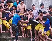 While a huge crowd gathers around the pond and on rooftops to watch the ritual,[3][7] a young man jumps into the pond with a live young female goat on his shoulders.[1][6] While he attempts to drown the goat, other young men from various communities in and around Khokana join him.[1][6] They work together to prevent the goat from escaping.[8] While the group tries to drown the goat,[3] the youths also bite her with their teeth, and attempt to rip her apart with their bare hands.[1][9] The goat is reported to struggle for as long as forty minutes before she dies. Once the goat is dead, a competition ensues for the possession of the carcass.[3] Youths from different communities struggle to win it for their community,[6][7] which earns them the privilege of leading the religious procession that follows.[4] The struggle and tug-of-war for the possession of the carcass is reported to last as long as 90 minutes.[2] The youths that win lead a procession out of the pond, concluding the ritual sacrifice.