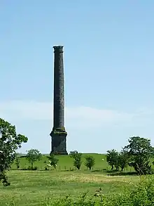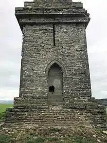 The 127-foot-high (38.7 m) tower, which is based on an upturned cannon, was built on common land near Derry Ormond.[7] The pedestal of the column is built of coursed square rubble stone, 8.3 metres (27 ft) high and 4.3 metres (14 ft) wide. The column itself is 31.4 metres (103 ft) high and has a square plinth and a rounded base 3.8 metres (12 ft) in diameter. The column swells in the middle and has a neck ring and a now-eroded band of corbels at its top. Apparently it was surmounted by a viewing platform, but is now covered by slate slabs and consolidated in concrete. The stairway to the top had narrow loops to admit light through the shafts.[4]