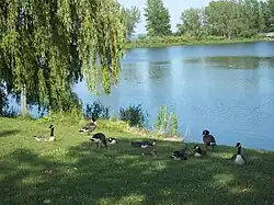 Canada geese along the shore of the park