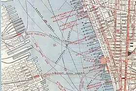 Map from 1879 of the Pennsylvania Railroad's Desbrosses Street Ferry and the Jersey City Ferry routes.