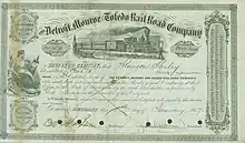 The Detroit, Monroe and Toledo Railroad was incorporated in the state of Michigan on April 26, 1855,[1] with headquarters in Detroit.[2] The charter allowed for a line originating in Detroit, Michigan, passing roughly along the shoreline of Lake Erie to the small town of Monroe on the Ohio-Michigan border. The DM&T obtained from the MS&NI the right to continue the line from the Michigan border to Toledo.[1]