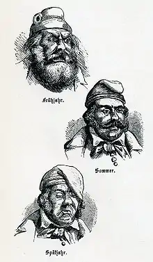 Michel differs from figures that serve as personifications of the nation itself, as Germania did the German nation and Marianne the French, in that he represents the German people.[1] He is usually depicted wearing a nightcap and nightgown, sometimes in the colors of the German flag, and represents the Germans' conception of themselves, especially in his easy-going nature and Everyman appearance. In any event, the nightgown and the night cap, which have been present in all pictorial representations of the German Michel – the first ones dating from the first half of the nineteenth century – are also interpreted in a way that the German Michel is, in fact, a rather naive and gullible person, not prone, for example, to question the authority of the government. On the contrary, he prefers a decent, plain and quiet lifestyle.