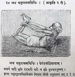 A similar pose named Nyubjasana, "the face-down asana", is described and illustrated in the 19th century Sritattvanidhi.[5] The pose is illustrated in half-tone in the 1905 Yogasopana Purvacatuska and named Dhanurāsana, quoting the Gheranda Samhita's description.[6]
