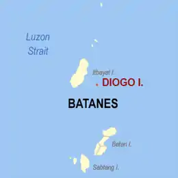 Diogo is a small, round island over 1,795 feet (547 m) high, about 34 mile (1.2 km) in diameter, lying 3.5 miles (5.6 km) southeastward of Itbayat Island. It is steep on the western side but has several small islets lying off the eastern side, the outermost being nearly 12 mile (0.80 km) distant.[4]