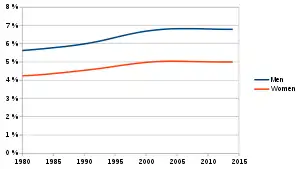 Evolution of the age-standardized prevalence of diabetes in Australia, from 1980 to 2014[1].