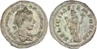 Having served as praetorian prefect under Caracalla, Macrinus participated in a plot to have the Emperor assassinated and exploited the resulting power vacuum to seize the throne for himself on 11 April 217, three days after Caracalla's death.[7] Shortly after, the eight-year-old Diadumenian was elevated to caesar – formalising his position as heir to the throne – at Zeugma, while his guard was escorting him from Antioch to Mesopotamia to join his father. He was also given the name Antoninus, in honour of the Antonine dynasty, at this time.[6][8] On 16 May 218 a revolt against him and his father was launched in Emesa by Elagabalus, whose mother, Julia Soaemias, was Caracalla's cousin. In order to put down the revolt, Macrinus led his legions to a fort at Apamea. There Macrinus elevated Diadumenian to augustus, making him co-emperor. After Macrinus was defeated by Elagabalus on 8 June 218, at the Battle of Antioch, Macrinus fled north and then to the Bosporus. Before fleeing, he entrusted Diadumenian to loyal servants, instructing them to take him into the Parthian Empire, to the court of Artabanus IV, to ensure his safety. Diadumenian was captured en route in Zeugma and executed in late June.[9][10] His head was brought to Elagabalus and reportedly kept as a trophy.[11]