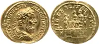 While caesar, a large number of coins were struck for Diadumenian, although fewer than the amount struck for his father. Coins in which he is depicted as augustus are extremely limited, and the only known coins from this time are denarii. This has led to the suggestion, first proposed by the ancient numismatist Curtis Clay, that a large issue of coins was being made for Diadumenian; however, they were quickly melted down when the news of Macrinus' defeat spread. Some eastern provincial coins from the period exist which give Diadumenian the title sebastos, at the time the Greek equivalent of the Roman augustus.[9] In terms of gold coins, Diadumenian has one known style of aureus, bearing his image on the obverse and displaying Spes standing on the reverse, and one known style of half-aureus, bearing his image on the obverse and displaying himself holding a sceptre and standard.[17]