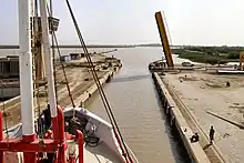 The Diama Dam, sometimes referred to as the Maka–Diama Dam (French: Barrage de Maka-Diama) is a gravity dam on the Senegal River, spanning the border of Senegal and Mauritania. It is located next to the town of Diama, Senegal and about 22 km (14 mi) north of Saint-Louis, Senegal. The purpose of the dam is to prevent saltwater intrusion upstream, supply water for the irrigation of about 45,000 ha (110,000 acres) of crops and create a road crossing for the road between St. Louis and Nouakchott in Mauritania. Additionally, a ship lock built within the dam provides for navigation upstream. Plans for the dam were first drawn in 1970 when the riparian states within the Senegal River Basin Development Authority agreed to develop the Senegal River. The Diama Dam was to be constructed in conjunction with the Manantali Dam which was to be located further upstream in Mali. Construction on the Diama Dam began on 15 September 1981 and was completed on 12 August 1986. The Manantali Dam was completed in 1988. The Diama project was funded by a US$149.5 million loan from the African Development Bank.[1] The main section of the dam with ship lock and spillway is 170 m (560 ft) long while a 440 m (1,440 ft) long embankment dam section extends north to the edge of the river. A dike further extends the dam to the north. The dam is 18 m (59 ft) tall and its spillway has a maximum discharge of 6,500 m3/s (230,000 cu ft/s).[2]