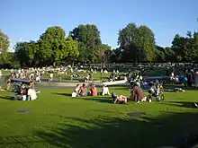 Diana was seen as a contemporary and accessible princess, so the goal of the memorial fountain was to allow people to access the structure and the water for quiet wading and contemplation. However, shortly after its opening, and after three hospitalisations caused by people slipping in the water,[10] the fountain was closed.[11] It reopened in August 2004, surrounded by a new fence, and people were prevented from walking or running in the water by six wardens.[12][13] Now, however, entering the water is once again permitted.