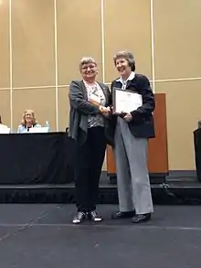 ![]() SAA President Dr. Diane Gifford-Gonzalez (left) presenting the 2016 Society for American Archaeology's Fryxell Award to Dr. Elizabeth Reitz (right) | |