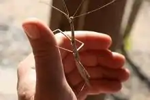 Diapheromera covilleae, the creosote bush walkingstick, is a species of stick insect in the family Diapheromeridae.[1] They are about 5 to 10 centimetres (2.0 to 3.9 in) long depending on the sex, with large tarsal hooks at the end of each leg for superior grip to branches or other objects. They have small eyes and horn-like spines on the head and anus. Since they do not have wings, they travel by walking along branches of trees and bushes, sometimes walking along the ground in search for the next perch or food source. Females are usually 3 to 4 centimetres (1.2 to 1.6 in) longer than males and have a larger body. Females are also grey in color while males are more brown.[2]