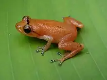 Adult males measure 17–22 mm (0.7–0.9 in) and adult females 21–25 mm (0.8–1.0 in) in snout–vent length.[5] The head is as wide as the body and longer than it is wide. The snout is long, and subacuminate in dorsal view, and truncate in lateral view. The tympanum has its upper edge hidden by the low, poorly-defined supra-tympanic fold. The fingers have weak lateral keels and small discs. The toes are basally webbed and have lanceolate discs. Dorsal skin is smooth but may have low tubercles in some specimens. The dorsum is yellowish-tan with yellow flanks. There are some reddish brown dorsal markings: an inter-orbital bar, narrow canthal and broader post-orbital stripes, as well as smaller markings in the scapular region and on the shanks. The iris is golden bronze and has a reddish-brown horizontal streak.[6]