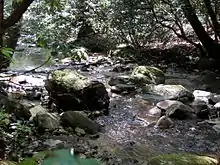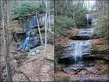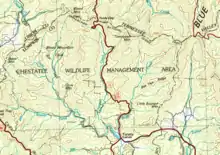 Dicks Creek rises in the Blood Mountain Wilderness, just southwest of Blood Mountain, in the confines of the Chattahoochee-Oconee National Forest in Lumpkin County in Georgia.[2] The creek heads in a southerly direction away from Blood Mountain for approximately 2.3 miles, and picks up Lance Creek from the west, just before its confluence with Blood Mountain Creek, which has paralleled Dicks Creek from the foot of Blood Mountain on the east. Dicks Creek picks up Miller Creek from the west after another 0.8 miles, then turns to the southeast and picks up Waters Creek, also from the west, before heading east for 2.8 miles and meeting Frogtown Creek, where the Chestatee River begins at the confluence of the two creeks very close to the intersection of State Route 9 and U.S. Route 129 at Turners Corner.[3] A portion of Dicks Creek is on the Appalachian Trail.