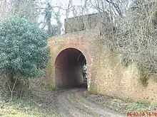 Intermediate stations were to have been provided on the route and a story grew up that the St James' Park, Southampton site in Shirley was excavated for this purpose, often repeated in local books.[8][2] Deposited plans, however, show the park site already existed within the surrounding road layout and was not part of the planned route, which ran to the north east of St James' Church; its current sunken appearance was caused by later gravel extraction.[11] Archival research by the Shirley Local History Group, notably among the records of a local landowner revealed that a later revival of this scheme, the Southampton and Winchester Great Western Junction Railway, intended to use the park as the original route at this location had by then been developed. Plans and sections dated 1901 show the intended route of the railway as passing through the park from East to West.[12] Records indicated that property sales were discussed for this scheme, which would have followed a slightly different route to the previous scheme in some areas without a tunnel at Chilworth. South of St James's Park at this time Didcot, Newbury and Station (now Stratton) Roads were named. Station Road also contained a police station.[13][14] The only physical remnant of the project in Southampton is the tree covered embankment hidden behind current properties east of Hill Lane between Milton Road and Commercial Road. The deposited plans for the route through Southampton[11] and current land levels suggest this was also the location of the viaduct work described by Sands.[15] A photograph described as illustrating the part built viaduct from the London and South Western Railway appears in both the book An Illustrated History of the Didcot, Newbury and Southampton Railway[16] and in a detailed article about the Didcot Newbury and Southampton Railway in Southampton in the Hampshire Industrial Archaeology Society Journal, No. 26 (2018).[9]