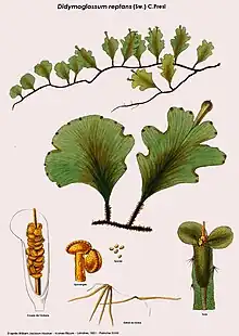 The genus Didymoglossum was first described by Nicaise Auguste Desvaux in 1827.[1] Its status, like other genera in the subfamily Trichomanoideae, remains disputed. The Pteridophyte Phylogeny Group classification of 2016 (PPG I) accepts the genus, placing it in the subfamily Hymenophylloideae and saying that there are about 30 species.[3] As of October 2019, the Checklist of Ferns and Lycophytes of the World listed 55 species,[1] whereas Plants of the World Online sank the genus into Trichomanes.[4]