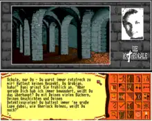 In contrast to classic text adventures, which have no images, Die Kathedrale has 120 pictures of various locations to accompany the text.[1][4][5][6][7] Die Kathedrale's backgrounds can be interacted with in the style of a point and click adventure, while interactions with objects are inputted using text commands.[5][6][3] In addendum to text commands, Die Kathedrale has a grid of icons for common commands, i.e. ascending or descending stairs and picking up items, and these icons can be clicked to input them.[4][3] Die Kathedrale has a time limit of 56 in-game hours; after this point, the alternate time zones will become inaccessible and the game will end.[5][6][3] Die Kathedrale has 150 different rooms[5][6] and over 300 pages of text.[3]