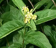 Diervilla sessilifolia, the southern bush honeysuckle,[1] a member of the honeysuckle family Caprifoliaceae which blooms in summer, is a perennial shrub found in the Great Smoky Mountains[2][3] and the southern Appalachian Mountains.[4] Southern bush honeysuckle can be found growing on bluffs, along slopes and stream banks, and bordering woodlands. It is a threatened species in Tennessee.[5]