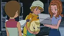 A scene from Digimon Hurricane Landing!! cut from Digimon: The Movie, where Mimi (pictured right) appears and is captured by Wendigomon with the rest of the older DigiDestined.